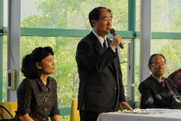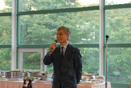 ドイツから駆けつけた眞峯紀一郎さん コンサート終了後には、会場を移して「スズキ・メソードOB・OG会」の創立総会、発足のセレモニーがありました。卒業して数年の人から、何十年か前に卒業した人まで幅広い年齢層のOB・OGたちに指導者も加わり、その数80人以上。その場で、会則や役員が承認され、かねてより念願のOB・OG会が正式に発足しました。出演してくださったヴァイオリニストの渡辺玲子さんをはじめ、発起人でもあるピアニストの江澤聖子さんや棋士の佐藤康光九段に加え、ドイツから駆けつけてくださったヴァイオリニストの眞峯紀一郎さんなど、OB、OGがお祝いに駆けつけ、「応援します」という力強いご祝辞をくださいました。「数日でも、どこの国ででも、スズキ・メソードに在籍した人は仲間」という考え方に基づき、これからいろいろな企画や計画を「一生楽しめるスズキ・メソードをめざして」進めていきます。