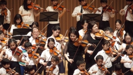 続く第2部「子どもの未来と音楽の力で豊かな創造性を!」では、スズキ・メソードOB・OG会会長で、才能教育研究会業務執行理事の木村眞一氏の挨拶とヴァイオリン演奏。エルガーの「愛の挨拶」をピアノ伴奏で独奏。さらにはスズキ・メソード銀座教室の生徒さんたちが出演し、以下の4曲を演奏しました。いつものように、曲の進行に合わせて少しずつ増えてくるスズキのスタイルに、場内からはにこやかなスマイルが満ち溢れていました。