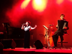 山口蘭子さん(左) そして、第3部「教育の機会均等、子どもの貧困解消を願って!」には、シャンソン歌手の山口蘭子さんらが出演され、舞台の雰囲気もガラッと変わりました。演奏曲は、以下の通りです。