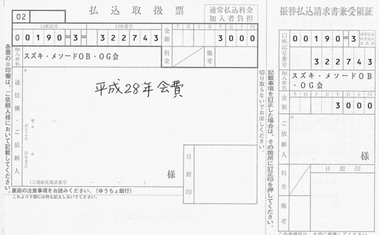 スズキ・メソードOB・OG会はボランティアにて運営され、企画事業および事務の諸経費は皆様の会費により賄われています。新規登録の方はもとより、継続登録の方々にも引き続き、OB・OG会へのご理解を賜り、会費のお振込みをどうぞよろしくお願いします。