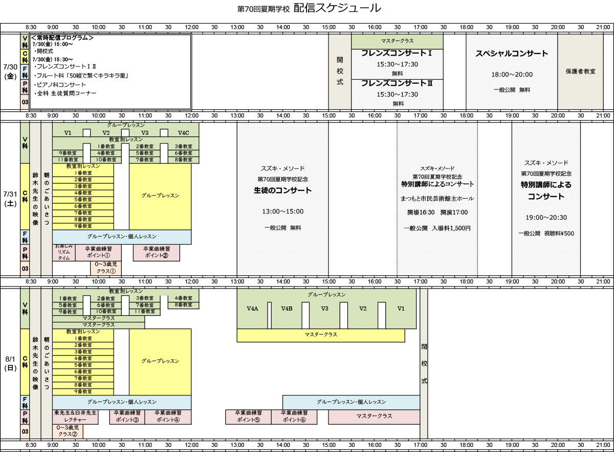 ※ヴァイオリン科とチェロ科の教室別レッスンは、生徒登録をしてその教室を選択した生徒のみZoomで参加し、それ以外の夏期学校参加者はVimeoで配信される映像を視聴することになります。
