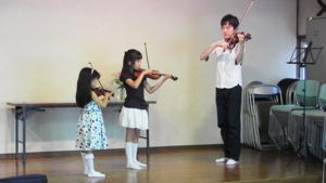 真希子とSちゃんの視界には、もう聴衆はおらず、K君のみである。彼女たちは憧れのK君を時々チラッ、チラッと見ては、「あらら・・・」と楽器を構える姿勢を直してみたり、動きが鈍くなっていたお肘をしっかり動かしはじめたり、歌心たっぷりのK君につられてメロディーを味わうような表情になって弾いたり・・・。達子先生は「子どもにとっての先生は、私じゃないのよ。お兄さん、お姉さんなのよ」とおっしゃっていたことがあったが、それを実によく心得ていらっしゃる。真希子は憧れのK君と一緒に弾ける喜びを存分に味わっていた。それは、演奏する彼女の全身から伝わってきた。K君はK君で、先輩として小さい子どもたちを思いやってくれた。演奏に余裕があるので、真希子やSちゃんを時々優しい目で見ては、彼女たちに悪い見本を見せないようにと、心を込めて演奏していた。後日、K君のお母様からうかがったが、彼は「お見合い」をさせて弾かせたこのときの達子先生の教育的配慮について、「脱帽」との感想を述べていたそうである。