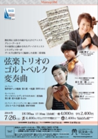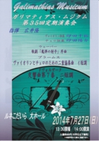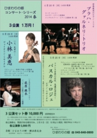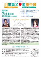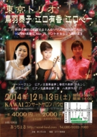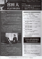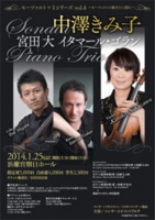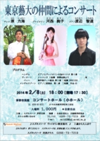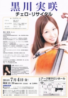 - 2014年1月8日(水)19:00開演 チェロ科OGの黒川実咲さんが、ピアノトリオのコンサートに出演されました。 電気文化会館ザ・コンサートホール 小坂井聖仁(ヴァイオリン)、黒川実咲(チェロ)、古田友哉(ピアノ) 【入場料】3,000円、学生:2,500円 曲目 ・ドビュッシー:ピアノ三重奏曲 ト長調 ・シューマン:幻想小曲集 イ短調 0p.88 ほか 《問》ON music project(北川) tel.080-4300-7611