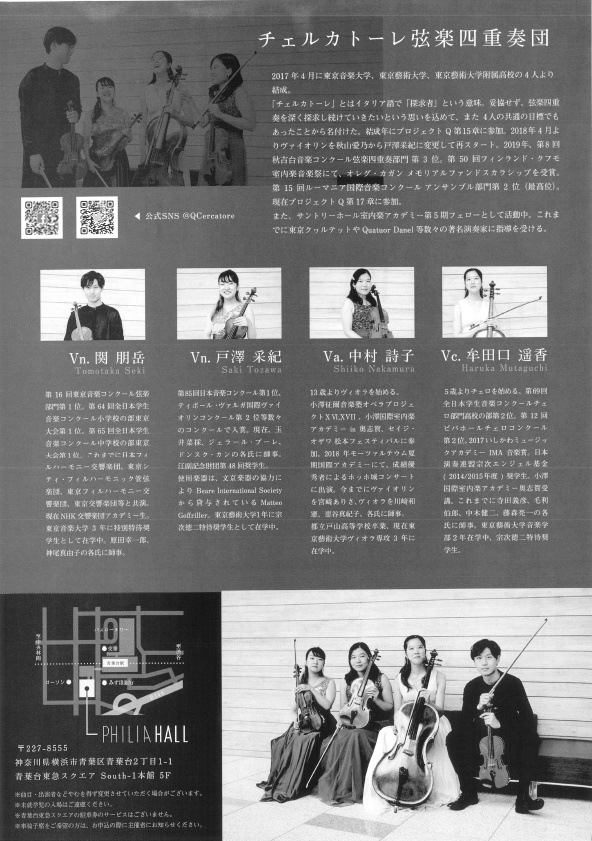イタリア語で「探求者」という意味を持つ「チェルカトーレ」の名前を冠した弦楽四重奏団の演奏会です。OBの関 朋岳さん(ヴァイオリン)、OGの牟田口遥香さん(チェロ)が参加されました。