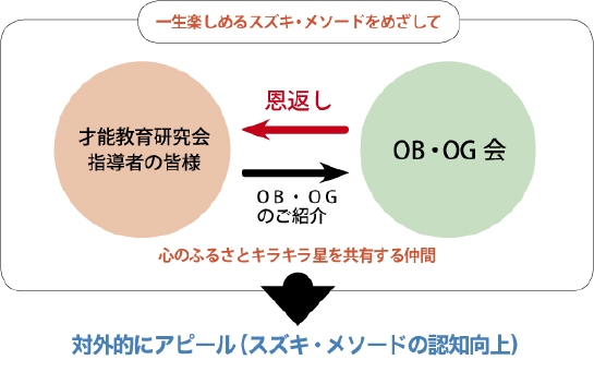 私たちスズキ・メソードOB・OG会は「心のふるさとキラキラ星を共有する仲間」です。多くの人が両親,指導者の先生,そして鈴木鎮一先生に大変お世話になりました。各人がこの思いを胸に刻み,鈴木先生が常におっしゃっていた生涯学習の重要性、すなわち「一生楽しめるスズキ・メソード」をより幅広く実現するためにお役に立ちたいというのが私たちの共通の願いです。OB・OG 会活動を広めていくことが、そのまま「才能教育研究会への恩返し」と考えています。スズキ・メソードが単なる音楽教育ではない、人間教育の場であったことを身をもって体験して来た私たちだからこそ、世の中に発信できるパワーがあります。