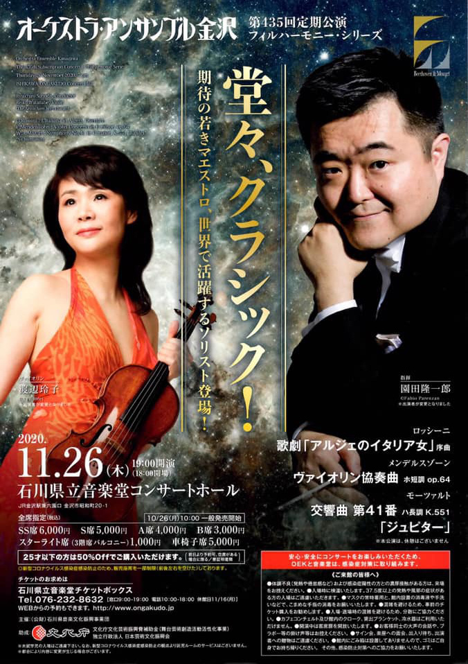 ※未就学児入場不可 渡辺玲子(ヴァイオリン)、園田隆一郎(指揮)、オーケストラ・アンサンブル金沢(管弦楽) 曲目 ・ロッシーニ:《アルジェのイタリア女》序曲 ・メンデルスゾーン:ヴァイオリン協奏曲 ホ短調 作品64 ・モーツァルト:交響曲 第41番 ハ長調 K. 551 「ジュピター」 《問》石川県立音楽堂チケットボックス TEL 076-232-8632