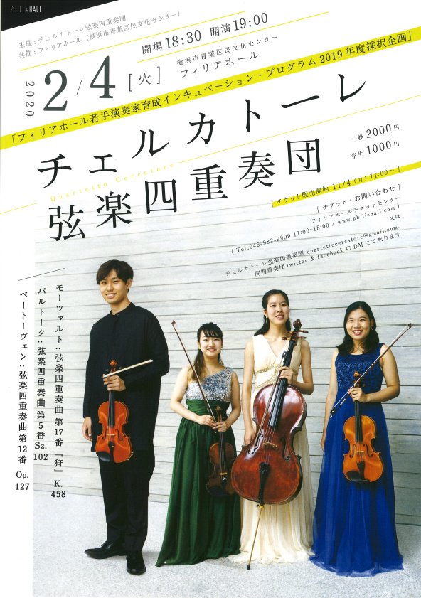 イタリア語で「探求者」という意味を持つ「チェルカトーレ」の名前を冠した弦楽四重奏団の演奏会です。OBの関 朋岳さん(ヴァイオリン)、OGの牟田口遥香さん(チェロ)が参加されました。